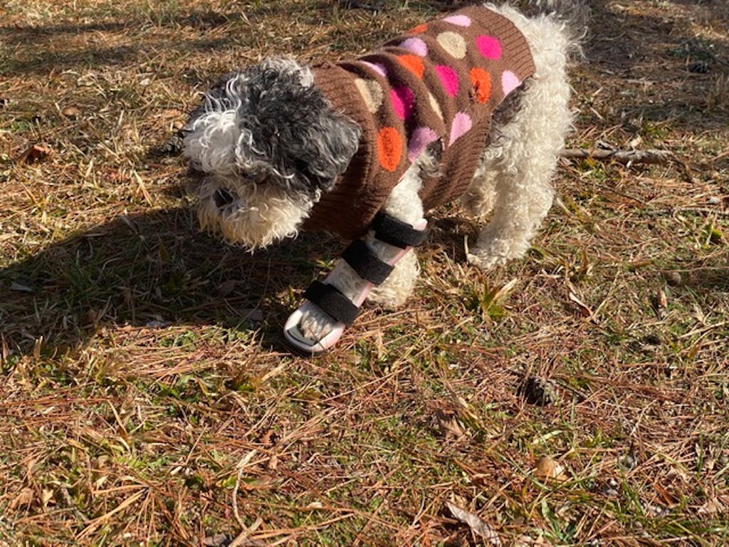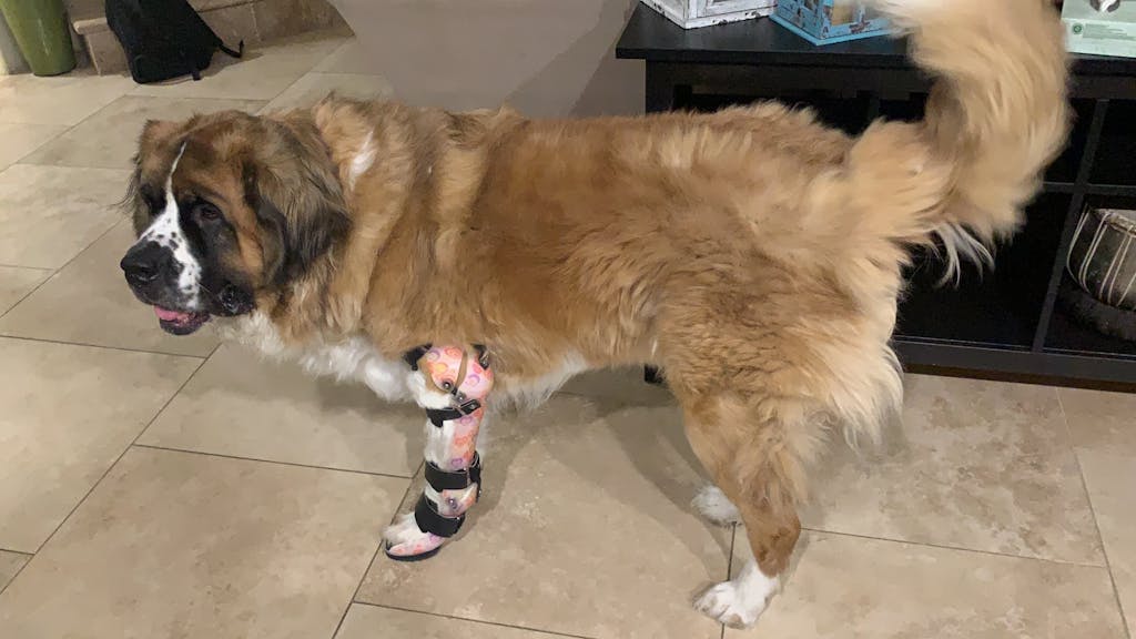 Puccini fractured his elbow and the vet put a very tight splint on it. They told us to come back in two weeks, but after 10 days, we smelled a horrible odor coming from his leg. He had three infected sores from the tight splint, so we did some research and found this custom brace. He is able to walk with it while his leg heals, and we can take it off when he's in his bed. I am so thankful for this brace. I truly believe it saved Puccini's leg.