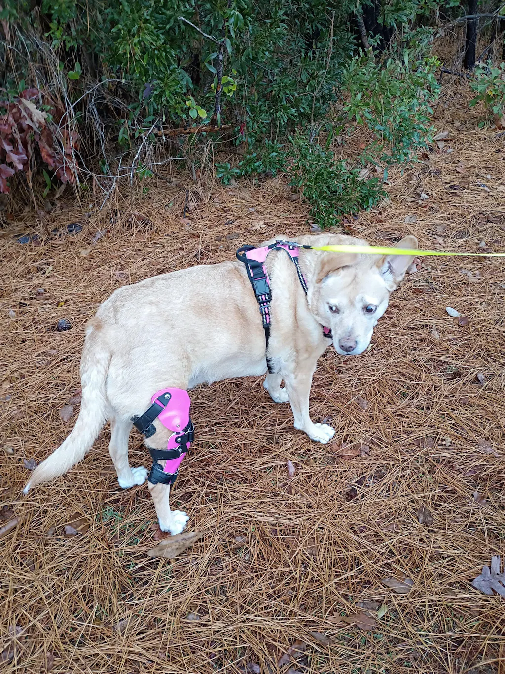 My dog needed a brace for his right hind leg. The brace he received has worked fantastically thus far. My dog, Kaiser, has been able to enjoy his walks, and he still thinks he's a bullet.